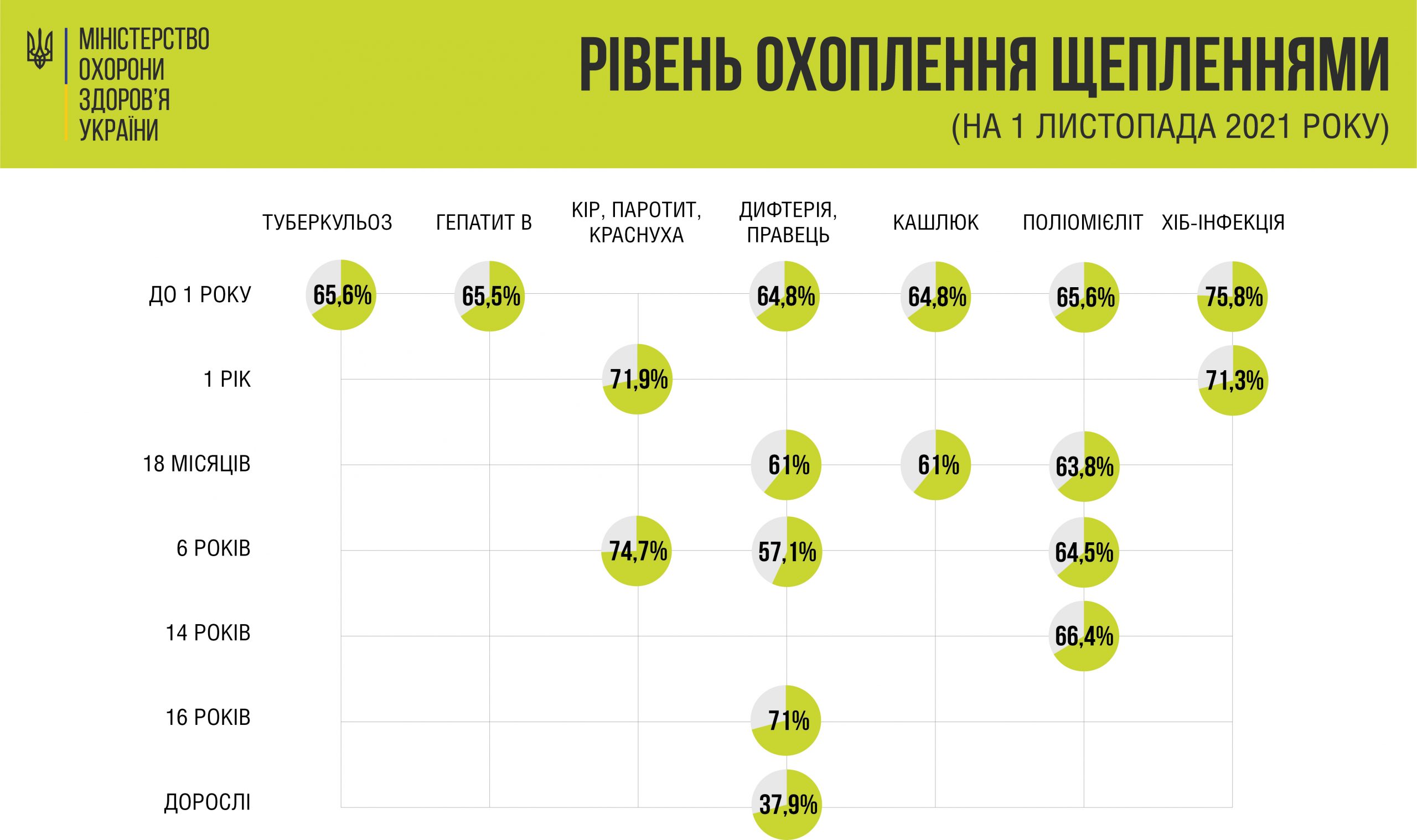 Перше щеплення у віці 1 року станом на 1 листопада отримали 71,9% дітей, а друге (у віці 6 років) — 74,7%.